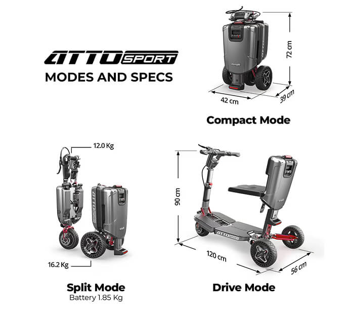 Weighing just 12 kg and 16.2 kg in its two split parts, the ATTO SPORT is exceptionally portable and simple to handle. In compact mode, it measures 42 cm (L) × 39 cm (W) × 72 cm (H) for effortless storage and transport. Once unfolded, its 90 cm height, 120 cm length, and 56 cm width deliver the perfect balance of comfort and agility—making it the ideal travel companion for those who demand both mobility and convenience.