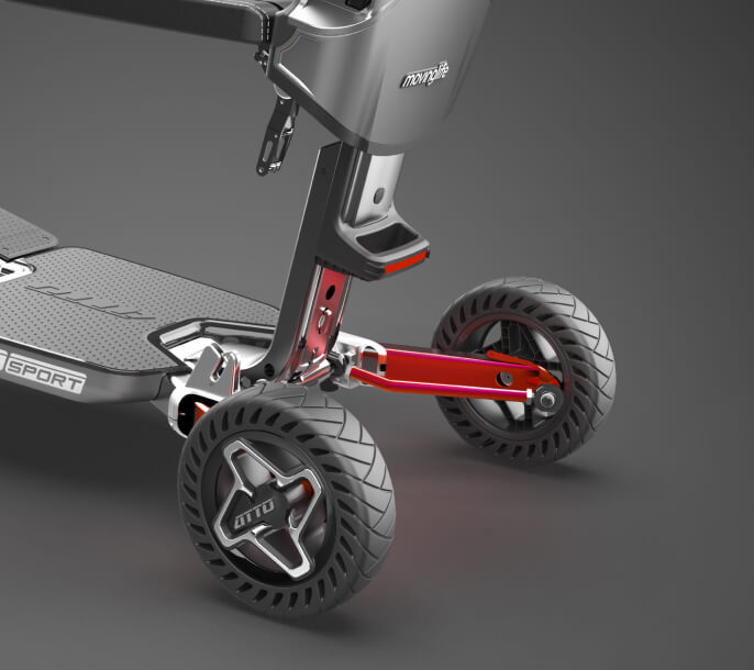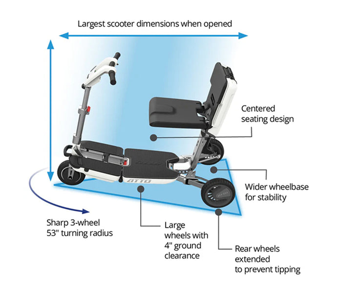 The ATTO mobility scooter’s smart triangular stability design combines a sharp turning radius, large high-clearance wheels, and a wider wheelbase for exceptional balance. Extended rear wheels prevent tipping, while the centered seating position ensures a perfect blend of stability and agile maneuverability — all in one sleek, stylish ride.